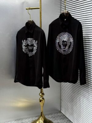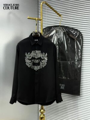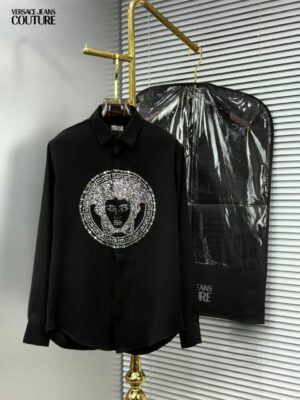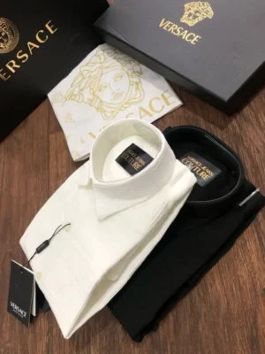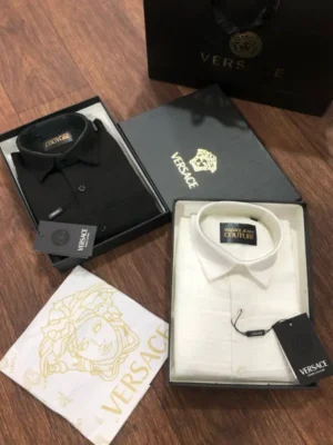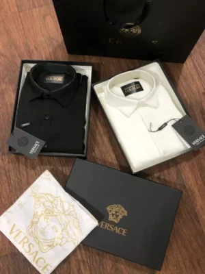 - Versace premium shirt for men. Approx. length: M is 134 inch chest Spread collar; three-button placket. Signature check facing. Straight hem. Cotton Machine wash, dry wash. Imported and very premium article with all bar code scannable.